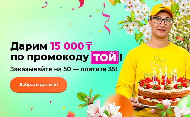 Как работает промокод: наберите в корзину товары на сумму от 20 000 тенге. Примените промокод, чтобы к оплате осталось не менее 15 000 тенге (минимальная сумма заказа).
