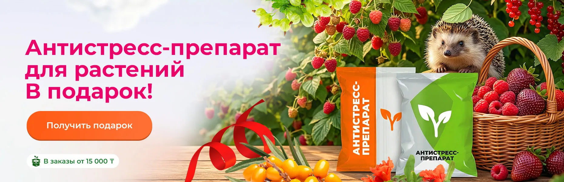 Как его получить? Просто оформить заказ на 15 000 тенге. Товары из разделов Агрохимикаты и Товары для сада в акции не участвуют.